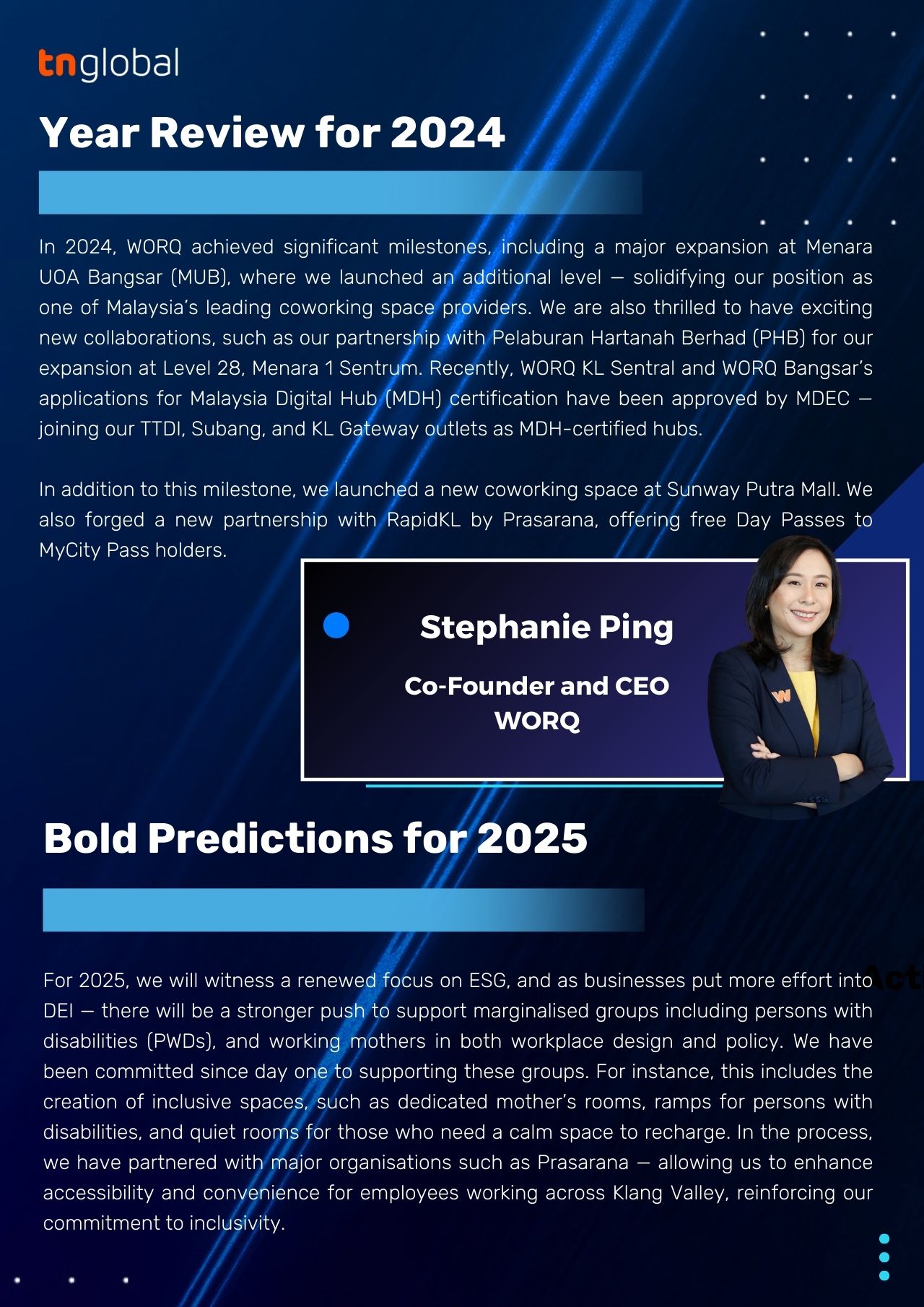 We talked to Stephanie Ping, Co-Founder & CEO of WORQ, to learn more about the company’s achievements in 2024, its plans and aspirations for 2025.